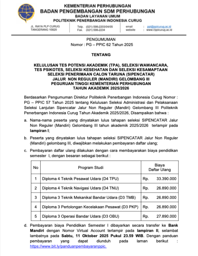 Pengumuman Hasil Tes Bakat Terbang dan Kelulusan Seleksi Penerimaan Calon Taruna Jalur Non Pola Pembibitan Tahun Akademik 2024/2025